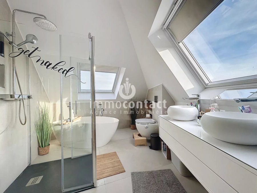 - Grenier aménagé en 3ème chambre à coucher avec placards encastrés et salle de bain comprenant douche, baignoire, meuble vasque, WC et fenêtre