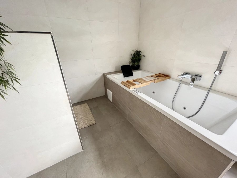 - Salle de bains avec douche à l'italienne, baignoire Whirpool, meuble vasque, WC et fenêtre