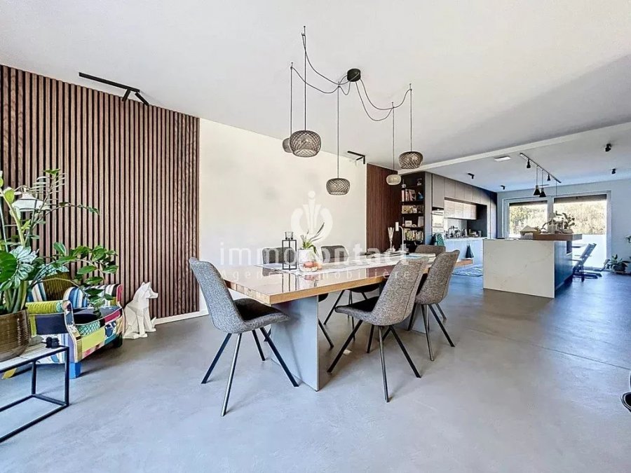 The estate agency Immo-Contact is pleased to present a superb, recently built house, constructed in 2021, set back on three sides, with a living area of approximately 260 m² on a plot of 4.70 ares, offering spacious rooms and a modern, bright and particularly pleasant living environment, situated in Kaundorf, in Luxembourg, within a quiet and sought-after residential development.