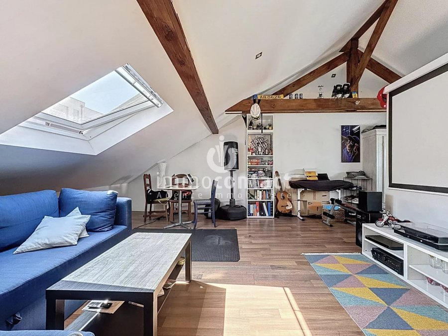 Grenier aménagé en studio avec chambre, salon et espace dressing.